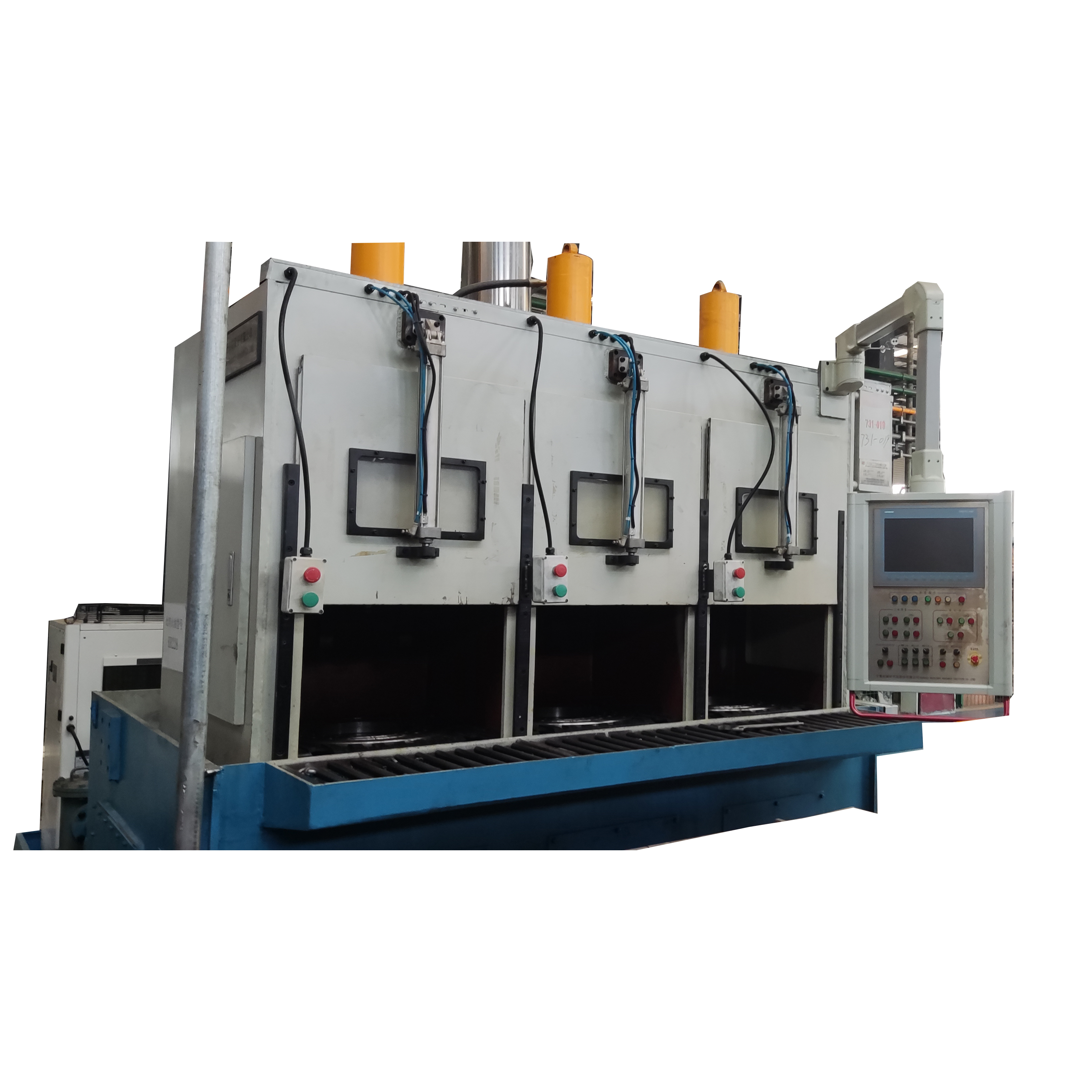 CCY-3S-300A型三工位同步器淬火壓床 ,是用于滲碳緩冷后的汽車同步器零件(如:滑套)進行再次加熱限形淬火的專用設備。對零件尺寸限形及表面硬化處理,零件通過二次加熱后迅速轉移至淬火壓床實施急速冷卻,并在模具的限形作用下,有效阻止零件的漲縮,減小零件形變和畸變,從而達到工件尺寸保持一致性和重復性的目的。該壓床每工位單獨完成工件的淬火整形過程,可進行自動/手動操作,PLC程序控制。