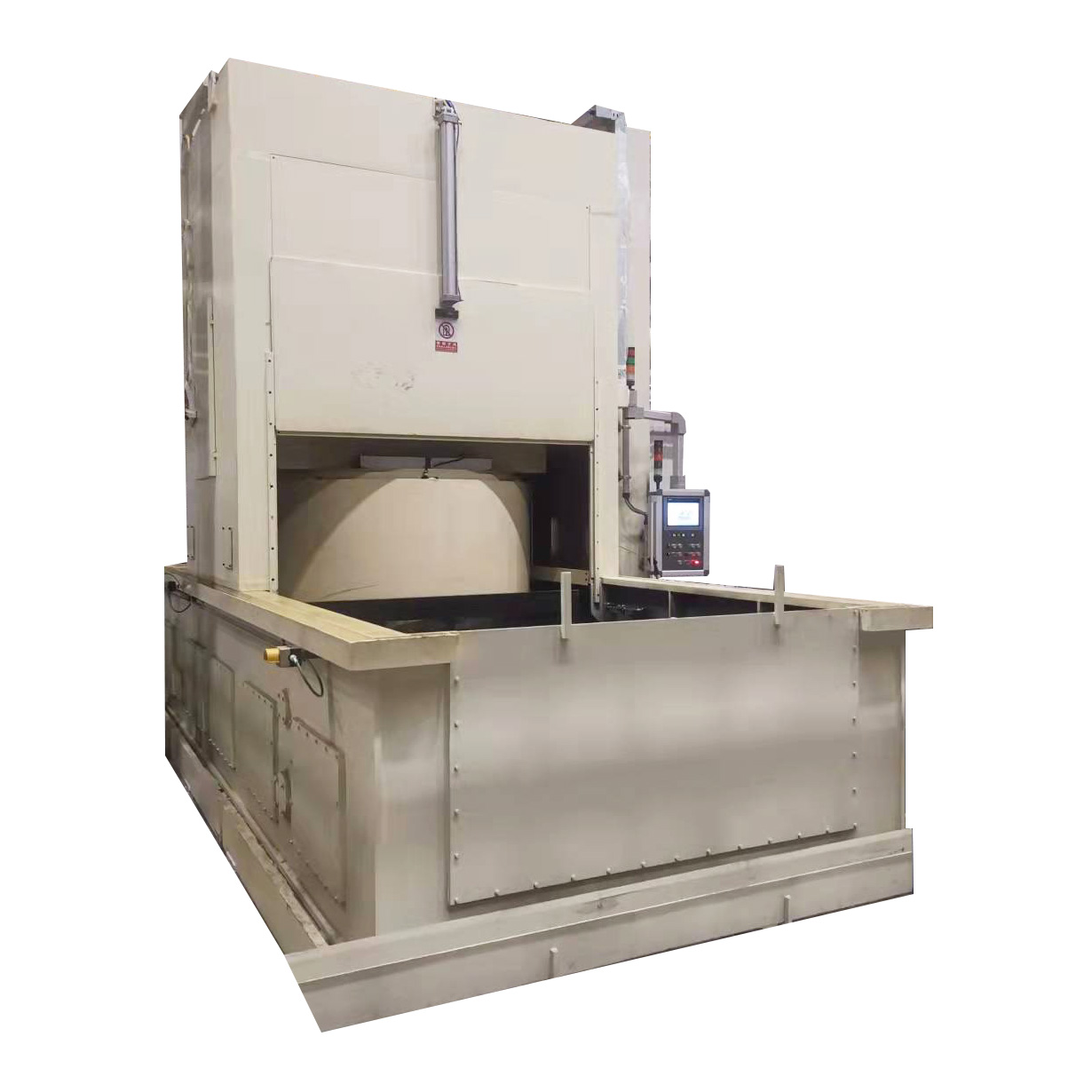 本設(shè)備對(duì)壓床各個(gè)功能部分進(jìn)行了特殊設(shè)計(jì)。該壓床可滿(mǎn)足滲碳鋼軸承單錐、雙錐及圓柱內(nèi)孔工件的單工位淬火。采用封閉式機(jī)身,利于工作循環(huán),節(jié)省循環(huán)時(shí)間,淬火過(guò)程防止油液外漏;機(jī)身全部采用焊接結(jié)構(gòu),加工方便,性能可靠,具有足夠的強(qiáng)度和剛度和良好的吸震性。機(jī)身與運(yùn)動(dòng)部件、控制系統(tǒng)、冷卻系統(tǒng)自成一體,獨(dú)立工作。依據(jù)不同的工件直徑更換相應(yīng)尺寸范圍的模具,可適應(yīng)尺寸Φ1000mm≤外徑≤Φ1800mm 、Φ800mm≤內(nèi)徑≤Φ1600mm 、高度≤500mm范圍內(nèi)的工件限形淬火的需要。